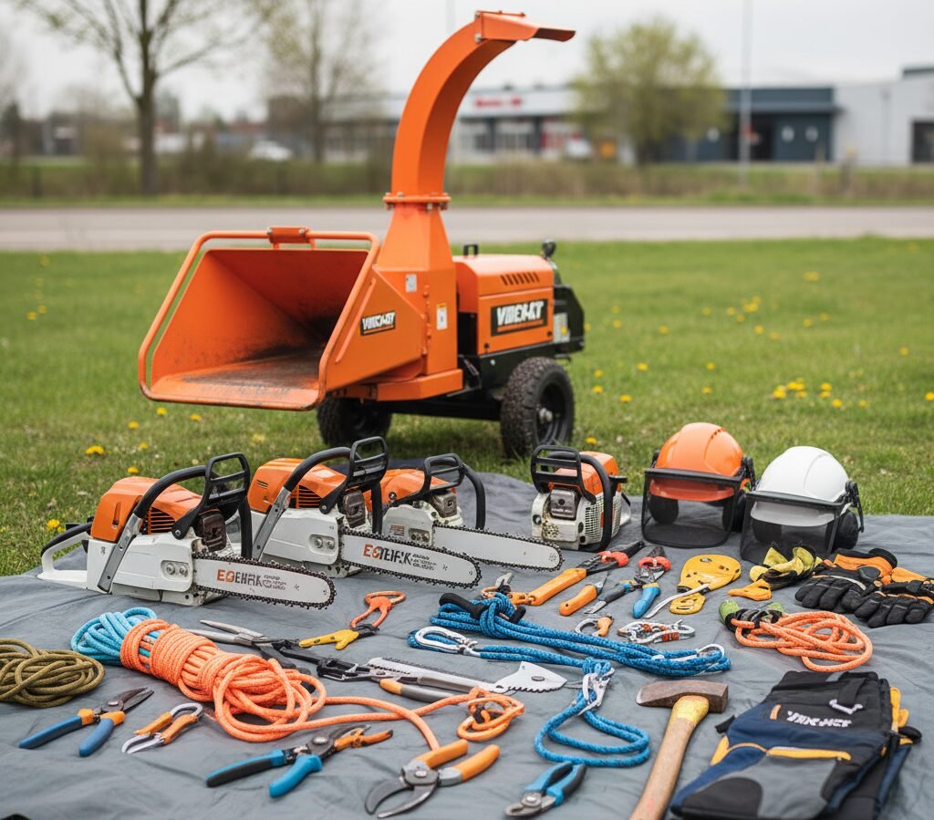 Overview image with chainsaws pole saw rigging ropes harness and PPE for tree surgery